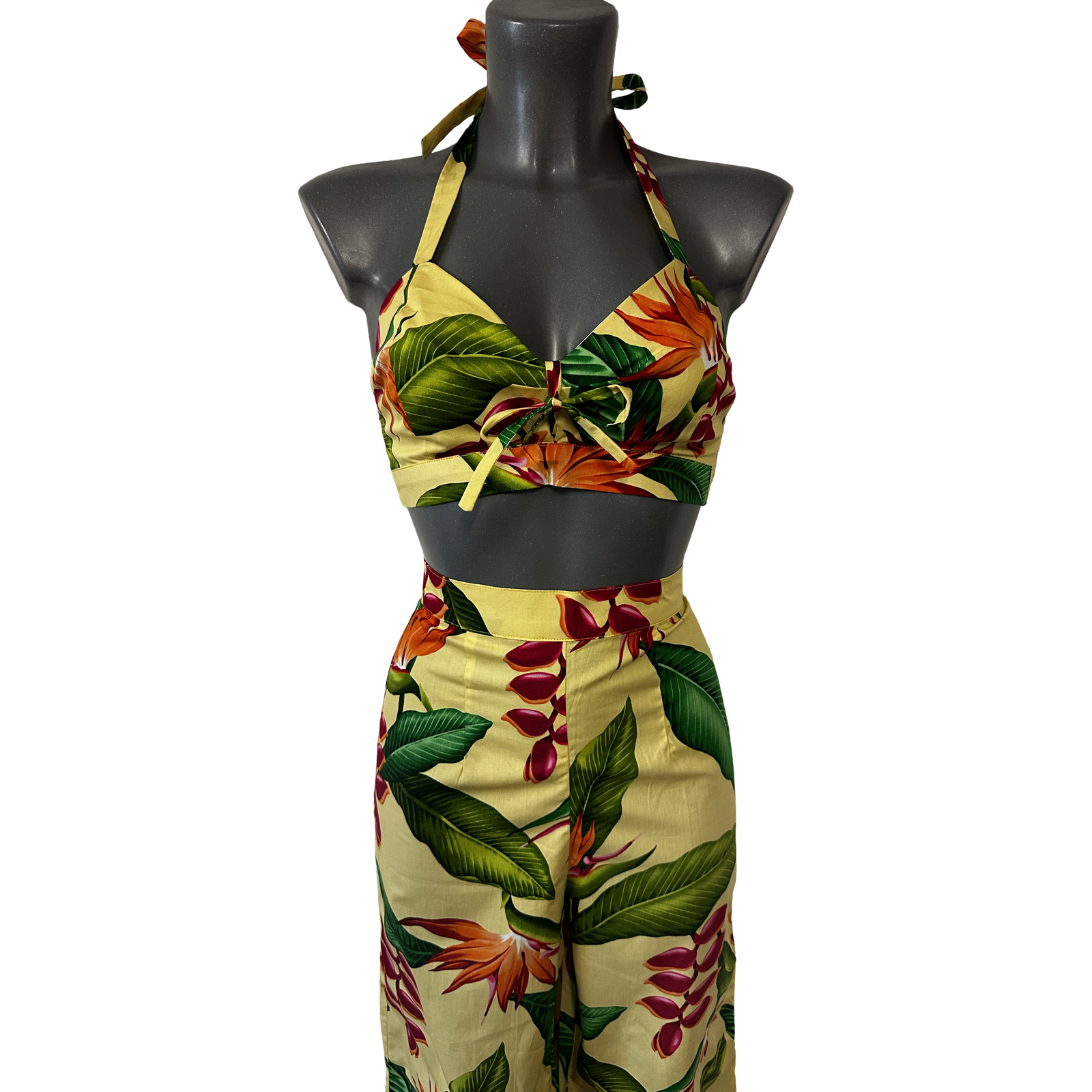 The bralette fastens with buttons. We matched this with our Coco trousers to finish the set. Why not try adding a bolero?
